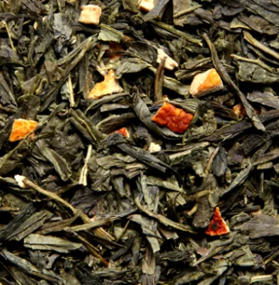 Sencha green tea flavoured with orange and blood orange, and sprinkled with orange peels.