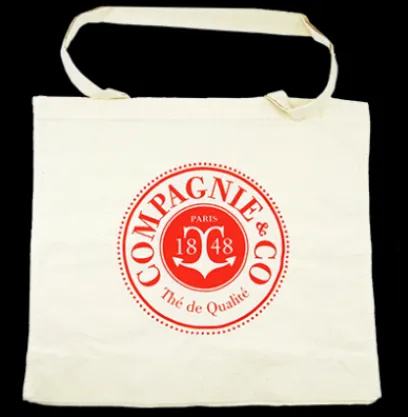 Red cotton tote bag with blue logo printed on both sides